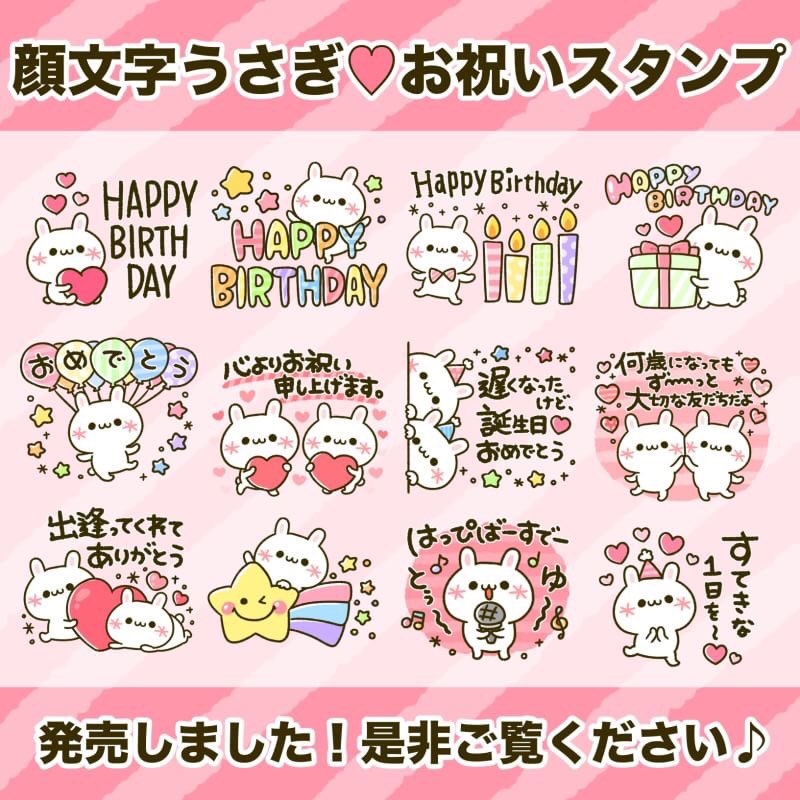 ট ইট র ぴよたぬき 可愛くお祝い 顔文字うさぎ Https T Co Rfailnc832 顔文字うさぎちゃん達が大切な人のお誕生日を可愛いくお祝いします お祝いする側 される側 どちらも使えるスタンプが揃ってます 是非ご覧ください 顔文字 お祝い 誕生